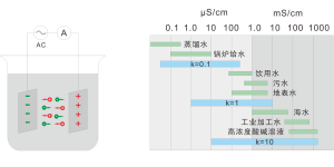 在样品溶液中放入两个同轴放置的电极,电极之间加一正弦波电压,并测量电流值,基于欧姆定律计算电导值G或电阻值R,通过与结构相关的电极常数K确定电导率。