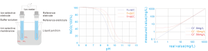 离子选择电极法采用电位感测原理,通常离子选择电极与水样接触的顶端是一层敏感膜,这层敏感膜对特定的离子有选择性,即硝酸根离子的浓度变化会在敏感膜表面产生一个电位差,这个电位差符合能斯特方程,测量该电位差可以计算出硝酸根浓度。